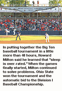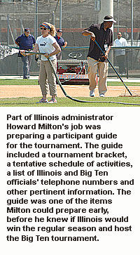 CHAMPAIGN, Illinois -- Spending the day before the start of the Big Ten Conference baseball tournament with Howard Milton was like being at Disneyland without the rides. Milton, assistant director of athletics at the University of Illinois, Champaign, is responsible for event management at the institution and thus responsible for piecing together just about every detail of the tournament.