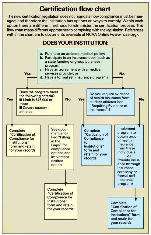 "Institutions don't have to send anything in to us," Sheely said. "The packets we mailed include a sample certification compliance form, but it doesn't have to be sent in, or even have to be used. We recommend that, however schools keep records for the institutional self-study or the athletics certification process, they also keep something on file to answer questions about whether they have done insurance certification."