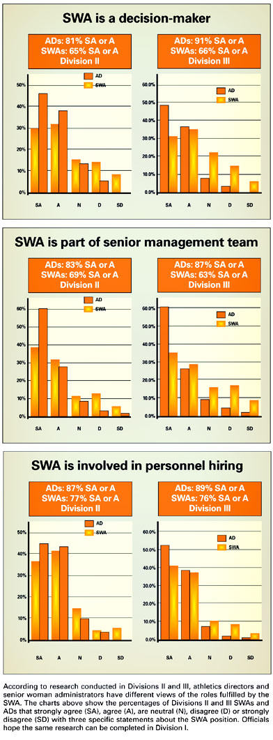 However, that shared perception of ADs and SWAs largely evaporated in other survey findings, most notably on decision-making and empowerment issues. ADs and SWAs in both divisions differed widely in their responses when asked whether they agreed with statements such as "the SWA is a decision-maker," "the SWA is a part of the senior management team" and "the SWA is involved in personnel hiring."