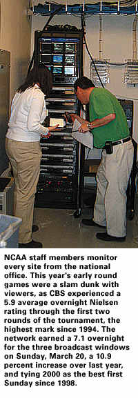 While Shaheen and his colleagues are concerned with the actual workings of the tournament, just down the hall from their nerve center, other staff members monitor the experience for the television viewer. In two small rooms, they sport headphones to keep up with the CBS television coverage of each game, filling out reports for each broadcast.