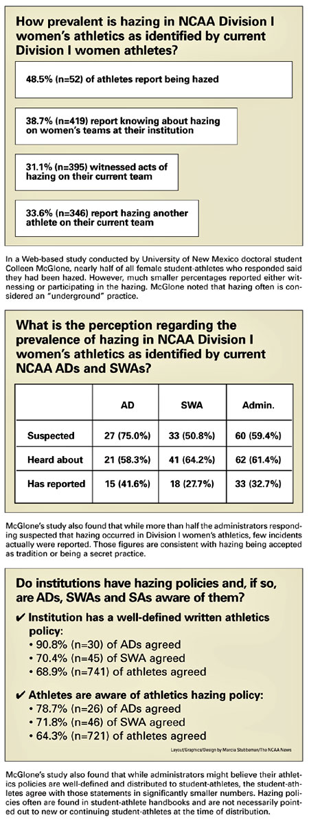 New Mexico visiting assistant professor Colleen McGlone, who received her doctoral degree in sport management earlier this year, conducted a Web-based survey in 2004 about hazing policies at individual institutions, the perceptions and prevalence of hazing practices, and the consequences of hazing. She surveyed athletics directors, senior woman administrators and more than 5,000 female Division I student-athletes in all NCAA sports.