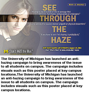 "We need to create a culture and a climate where hazing is talked about. This is one of the major problems because there is a lot of silence and secrecy about the issue," she said. She pointed to a program at the University of Michigan that is designed to educate students campus-wide about hazing.