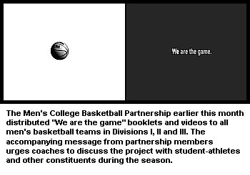 The "effort" consists of a "We are the game" booklet, a Web site that serves as a college basketball portal, a new college basketball mark, and a video that supports the book with narratives from basketball legends such as John Wooden, Emeka Okafor and Clark Kellogg. Each men's basketball coach in Divisions I, II and III has received 25 special-edition books for the student-athletes and a copy of the video to show at a team meeting or other function. Schools also have received additional copies of the book for distribution as they see fit.