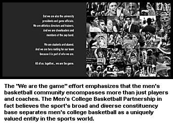 For the first time, a unified, consolidated and consistent message is being sent to the entire men's basketball community: "We are the game." More than simply a slogan, a logo or a promotion, the message is a collective strategy delivered through print, video and Internet technology that reminds stakeholders how fortunate they are to be part of something as special as men's college basketball. And it is just a start.