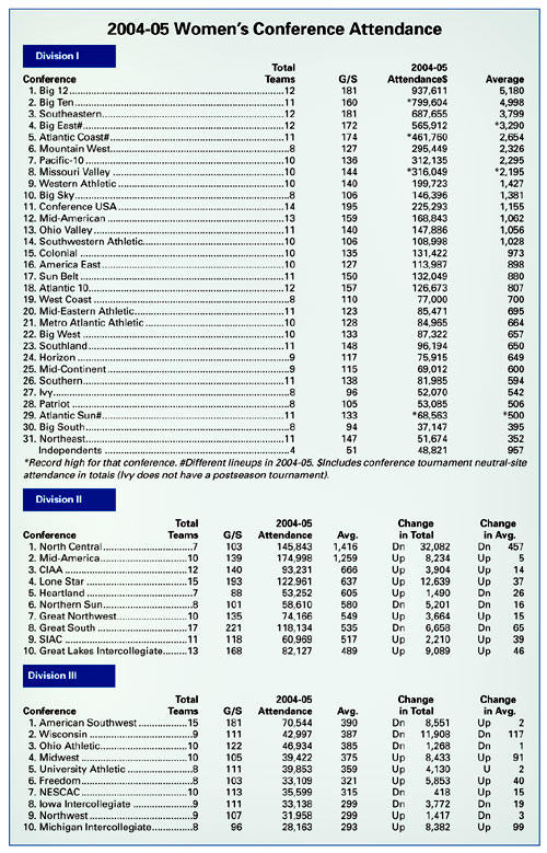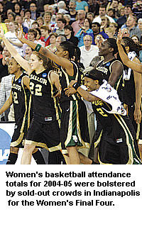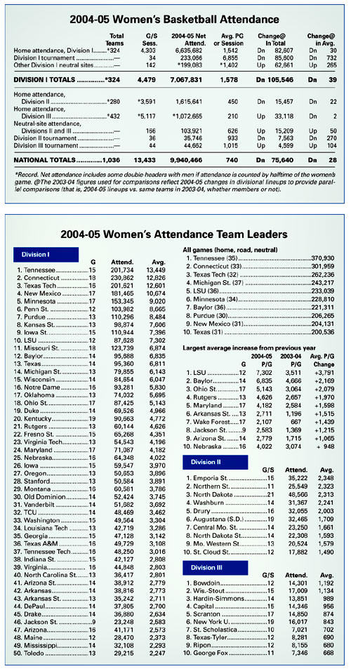 In Division I all-games attendance, Tennessee drew 370,930 in its 35 games, while Connecticut totaled 301,959 in 33. LSU had the biggest jump in 2004-05 with a plus-3,791 per-game boost to 7,302 from 3,511 last season.