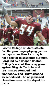 "Thursday games are a lot more fun," said Boston College junior quarterback Dan Berglund. "It's the only game of the night, it's nationally televised, it's a great atmosphere and you want to be in that situation. You're willing to make a concession, especially if it's just one game out of the schedule."