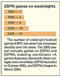 "Our league members recognize the value of the exposure," Benson said. "If you could play every game at 1 o'clock or 3 o'clock on a Saturday afternoon, that obviously is the most preferred time. But we really don't have a choice if we are going to take advantage of the power of ESPN. We're going to have to accept what days and what time they want to televise our contests."