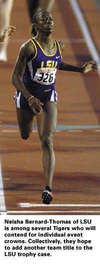 Championships notes: Stanford's hopes for a first indoor team title likely depend on how well its talented corps of distance runners fare in what look to be very competitive races. Two-time outdoor 10,000-meter champion Alicia Craig is a contender for an individual title after qualifying for the indoor 5,000 meters in her first outing of the season February 12, and teammates Anita Siraki and Julie Allen also could score well. Meanwhile, freshman Erica McLain had the best triple jump in Division I through February 13 ... Defending champion LSU remains a tough foe for Stanford or any other contender, with seniors Hazel Ann Regis contending for top honors at 400 meters and last year's 800-meter runner-up, Neisha Bernard-Thomas, again challenging defending champ Nicole Cook of Tennessee.