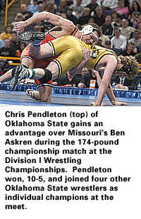 Pendleton also wrestled a familiar foe in his final match -- Missouri's Ben Askren, marking the ninth match between the two Big 12 Conference rivals in the last two seasons. Pendleton improved to 8-1 in those head-to-head matchups with a 10-5 victory and his second consecutive national title.