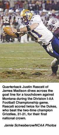 James Madison won its first Division I-AA Football Championship with a 31-21 victory over two-time champion Montana December 17 in Chattanooga, Tennessee. It was Montana's fifth trip to the NCAA championship game in 10 years but just the first for James Madison.