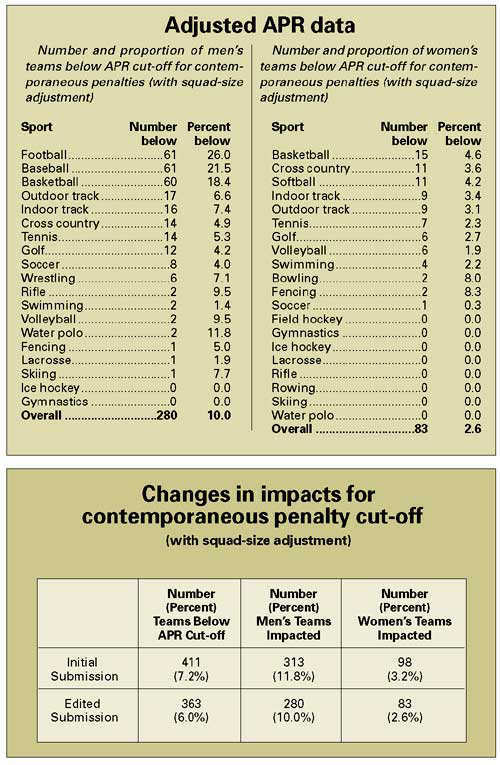 In the final analysis, the total number of teams for which APRs were submitted rose to 6,002 from the approximately 5,700 collected in February. Of those, 6 percent (363 teams) fell below the 925 APR cut-off for contemporaneous penalties (as opposed to slightly more than 7 percent in the first data collection). That figure includes the squad-size adjustment applied for teams with small data samples. Ten percent of all men's teams fell below the cutpoint and 2.6 of women's teams fell below the line.