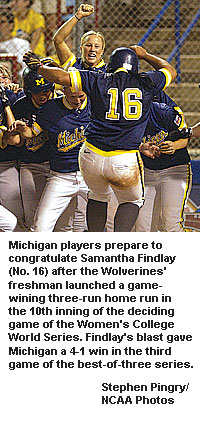 Findlay, who became the first freshman position player to be named the series' most outstanding player, drove in all four of her team's runs in the deciding game. She batted .409 with four extra-base hits and eight RBI in Michigan's seven Women's College World Series games.
