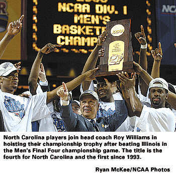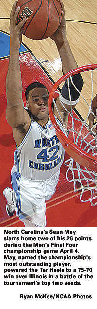 Junior forward Sean May, named the tournament's most outstanding player, led North Carolina with 26 points and 10 rebounds in the championship game. It's the second NCAA title in the May family, since his father Scott helped Indiana win the 1976 championship to culminate an undefeated season.