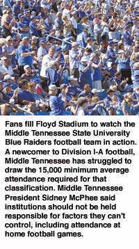 Sidney McPhee, president of Middle Tennessee State University, another school in danger of not making the minimum attendance requirement, said he believes the strategic plan's focus on student-athlete issues is "more important and should be our focus."