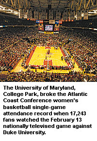 Miscellaneous: The University of Maryland, College Park, set an Atlantic Coast Conference women's basketball single-game attendance record February 13 when 17,243 fans packed Maryland's Comcast Center for a nationally televised game against Duke University. The effort was part of the school's "Cram Comcast" project led by Maryland President C.D. Mote Jr. and the First Lady of Maryland, Kendel S. Ehrlich, to break the ACC attendance mark of 14,500 -- set coincidentally by Maryland in 1992 at Cole Field House. The effort also was designed to call attention to the new Maryland Women's Heritage Center, the first state center of its kind in the nation that will provide a place to learn and teach about the contributions of Maryland women throughout the state's history. The center is an outgrowth of the Maryland Women's History Project, a collaborative venture between the Maryland Commission for Women and the Maryland State Department of Education. At halftime of the game (won by Duke, 60-49), President Mote presented a check representing the university's donation to the First Lady for the cause ... The SBC family of companies and the Cotton Bowl Athletic Association (CBAA) have extended their sponsorship agreement for four years -- through January 1, 2010. SBC has been the Cotton Bowl's title sponsor since September 1996. Bowl and city officials estimate that the SBC commitment will help the event generate $24 million for higher education and more than $120 million in direct spending for the city of Dallas from 2007 through 2010. Officials said the sponsorship extension parallels the new Bowl Championship Series (BCS) contract through 2010, providing the flexibility for the event to adjust to any future changes in college football's postseason structure. The SBC Cotton Bowl currently is affiliated with the Big 12 Conference and the Southeastern Conference.
