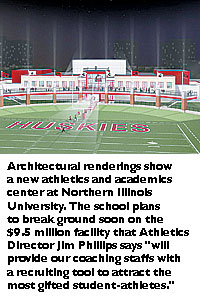Facilities: Northern Illinois University Athletics Director Jim Phillips announced at the university's annual spring football game the construction of a $9.5 million Academic and Athletic Performance Center -- the largest capital project in the school's athletics history. With $5 million in private donations already committed to the project, the effort has moved into the public phase for solicitations. When the $7 million campaign goal is reached, Northern Illinois will begin breaking ground for the new all-purpose facility. "The exposure that has resulted from our recent football successes has a profoundly positive impact on the university -- undergraduate enrollment applications soared, financial support rose and student and alumni pride and participation flourished," said Northern Illinois President John Peters.