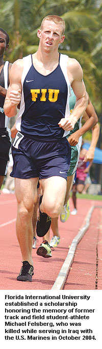 "Everyone loved him, from the most recognized student-athlete to members of the spirit squad. Every time you had any interaction with him on any level, it was evident that his university, his teammates and his fellow student-athletes were much higher on his agenda than he himself was. We are very grateful for this gift, not only for the impact it will have on student-athletes in perpetuity, but also for what it will do to preserve the memory of one of the most special young persons ever to be associated with FIU." Michael Felsberg was killed in combat last October in Ramadi, Iraq, while serving as a Marine second lieutenant. A weapons platoon commander, he had volunteered for duty in Iraq after hearing that a replacement was needed for an officer who had been killed in combat. Felsberg joined the Marines the day after he graduated from high school. After a four-year term, he ran track and cross country at Florida International and graduated in 2003 with a criminal justice degree. Members of the track and field team wore his nickname "Fels" on the back of their uniforms this year, while the football and softball teams each had a sticker with his initials on their helmets. The scholarship is the largest individual endowment gift ever received by the school's athletics department.