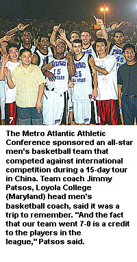 Miscellaneous: The Metro Atlantic Athletic Conference sponsored an all-star men's basketball team this summer that completed a 15-day tour of China, compiling a 7-0 record against international competition. "China is a fascinating country and our student-athletes benefited greatly by being exposed to its culture, history and basketball programs," said MAAC Commissioner Richard J. Ensor, who traveled with the team. Highlights of the trip included visits to the Great Wall of China, Tiananmen Square, the Terra-Cotta Warriors and the Forbidden City. "The MAAC trip was exciting culturally," said Loyola College (Maryland) head men's basketball coach Jimmy Patsos, who coached the team. "It was a learning experience for everyone, including myself. As far as basketball goes, it was great because we faced tough competition and played in seven different venues, including an outdoor court with 5,000 people watching. China is basketball-hungry, and we were very lucky to be a part of such an exciting tour." ... The Northeast Conference has begun a year-long celebration of its 25th anniversary with the unveiling of a silver anniversary logo. NEC Commissioner John Iamarino said the league will feature a host of promotions, Web-based activities and flashbacks throughout the 2005-06 campaign as the league pays tribute to its history. Included are 25th anniversary teams for basketball and a 10th anniversary team for football, and a "My Memories" campaign that uses audio clips and written anecdotes from NEC coaches, administrators, players and media who have been a part of the league over the last quarter century to reminisce about the games, people and moments that most stand out in their minds. "The NEC has a growing list of accomplishments to take pride in as we celebrate our 25th anniversary," said Iamarino, now in his ninth year as Northeast commissioner. "Our 11 institutions, 21 championship sports and more than 4,000 student-athletes are testimony to the growth we've enjoyed since the conference began in 1981. More than the memorable individual and team achievements we've enjoyed, however, I'm most proud of the NEC's fulfillment of its stated goal of integrating our athletics programs within the academic missions of our member institutions. NEC participants truly are both students and athletes." The Northeast Conference was first established as the ECAC-Metro Conference in 1981. Original members included current schools Fairleigh Dickinson University, Metropolitan Campus; Long Island University, Brooklyn Campus; Robert Morris University; St. Francis College (New York); St. Francis University (Pennsylvania); and Wagner College. Current all-sport members that have joined since then are Central Connecticut State University, Monmouth University, Mount St. Mary's University, Quinnipiac University and Sacred Heart University.