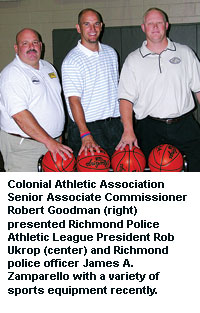 Miscellaneous: The Colonial Athletic Association donated athletics equipment to the Richmond Police Athletic League (PAL) recently. PAL is a nonprofit organization designed to help at-risk youth, providing structured programs supervised by local police officers serving as role models. CAA Senior Associate Commissioner Robert Goodman presented PAL president Rob Ukrop and Richmond police officer James A. Zamparello with a variety of equipment August 18. Over the past three years, the CAA has donated more than 150 basketballs, two basketball carts and 2,000 men's basketball championship tickets to be shared among PAL participants. The conference office also has provided two dozen volleyballs, including a pair of carts, and 100 T-shirts. When the PAL program recently began a youth lacrosse program, the CAA contributed two dozen lacrosse balls.