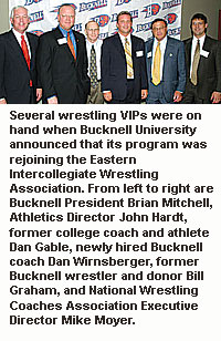 Bucknell first joined the EIWA in 1999-2000 and remained part of that affiliation until the Bison program was designated for club-varsity status after the 2001-02 season. Largely through a $5.6 million donation by former Bison wrestler Bill Graham, which also helped fund Bucknell women's athletics programs, the school announced in May 2004 that wrestling would return as Bucknell's 27th varsity sport in 2005-06 ... The Mid-American Conference and Temple University announced that the Owls will become a football member of the MAC effective for the 2007 season. Temple will be an affiliate football member of the MAC in 2005-06. The Owls will have four MAC opponents on their schedule in 2005, with six MAC opponents in 2006 and a full eight-game conference schedule, with eligibility to compete for the MAC championship, beginning in 2007. The Owls will be eligible for one of the conference's two bowl affiliations in 2005-06 and also participate in the MAC television package. In addition to the football membership, the MAC and Temple have agreed to develop scheduling opportunities in men's basketball, women's basketball and Olympic sports. Temple, in its 107th season of football, was previously a member of the Big East Conference from 1991 to 2004.