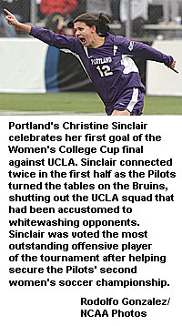 The Pilots attacked all of those streaks. Senior Christine Sinclair scored two of Portland's goals and finished her career as the NCAA tournament's all-time goal scorer with 25. The Pilots' Angie Woznuk and redshirt freshman Angie Rapinoe added the other two scores for Portland.