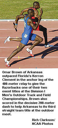 Arkansas' 17-point performance in the 200-meter dash -- keyed by a finish under 20 seconds by defending event winner Wallace Spearmon -- propelled the Razorbacks to their third straight Division I Men's Outdoor Track and Field Championships team title June 11.