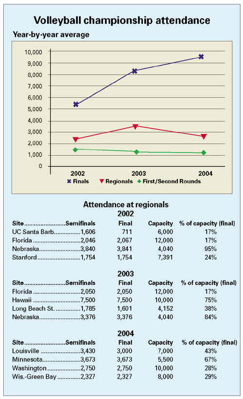 "We'd like to see it be bigger, and we'd like to see it sold out," said Hermann, the senior woman administrator at the University of Louisville. "We'd like this to be a really hard ticket to get. Right now, it is not a hard ticket to get. How do we get true fans to come? True fans in volleyball are usually participants who have played at some time in the past. How do we make it more participant-oriented? It's a phenomenal sport for women."