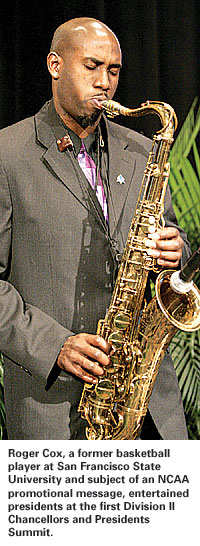 The entertainment for the celebration also had a Division II flavor. Roger Cox, a former basketball player from San Francisco State University who is featured in video segments promoting NCAA student-athletes, entertained the presidents with a collection of jazz tunes.