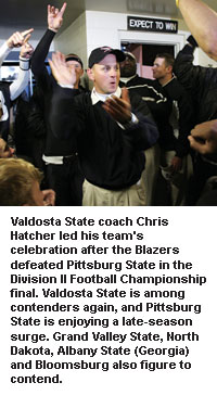 Championship notes: Grand Valley State will be seeking its third national title in the last four years ... North Dakota leads the nation in scoring defense, allowing just 9.0 points per game ... Bloomsburg's Jamar Brittingham was the nation's leading rusher as of late October, averaging 179.3 yards per game ... Albany State is allowing opposing quarterbacks only a 78.7 passing efficiency rating, which leads the nation ... Valdosta State has won 22 of its last 23 games.