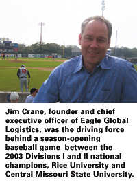 Crane is chairman and chief executive officer of Eagle Global Logistics, one of the nation's largest shipping companies. The company, publicly traded on NASDAQ, generated gross revenues of $2.2 billion in 2003. He has been generous with his alma mater, which has named the baseball stadium -- Crane Stadium/Tompkins Field -- partially in his honor.