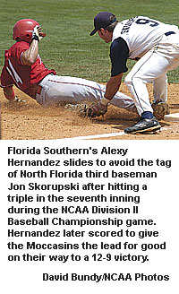 Florida Southern fought back one last time, just as it had throughout the tournament, scoring three runs in the third and again in the sixth to take a 9-8 lead. North Florida tied the game in the bottom of the sixth, but the Moccassins took the lead for good in the seventh on a triple by Alexy Hernandez -- one of the team's seven extra-base hits in the game -- and a run-scoring single by Nick Diyorio.
