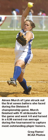With pitcher Aimee Murch delivering an 11-strikeout performance and home runs by Rachel Foster, Christina Rolla and Tiffani King, Lynn was able to defeat Kennesaw State, 5-3, in the final of the Division II Softball Championship May 23 in Salem, Virginia.