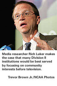 The ultimate answer, of course, is "both," but a panel of media experts came at the question differently during a June 26 panel discussion. Burke Magnus of ESPN-U and Tim Pernetti of CSTV said that while institutions should foster community support, they also should take advantage of the national television opportunities that will expand for Division II schools in years to come. Media researcher Rich Luker, however, said that smaller programs are missing a large opportunity if they focus on television at the expense of interacting with people in their own communities.