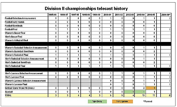 In 2004-05, a total of 17 championship finals, semifinals or selection shows will be televised -- 18 if a third game is necessary in the best-of-three softball finals. That contrasts with the 2002-03 academic year when only four championship finals were telecast.