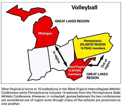 Another example: In volleyball, the West Virginia Intercollegiate Athletic Conference is aligned with the Great Lakes Intercollegiate Athletic Conference. However, the WVIAC teams are in a different region from the nearby Pennsylvania State Athletic Conference, so the regionalization policy actually discourages a number of natural, nearby rivalries.