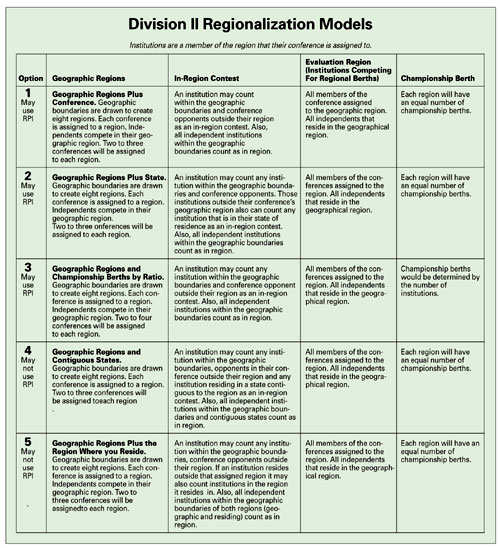 Certainly, there has been haggling aplenty to this point. Earlier this year, the task force advanced a map of how a revised regional approach might look. After a rough reception from various membership components, the map was taken off the table and replaced by a set of five concepts that conference commissioners, athletics directors and the Division II Championships Committee will consider in late June (see accompanying table).