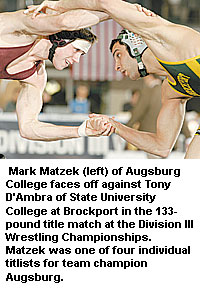 Augsburg's Matt Shankey (125), Mark Matzek (133) and Joe Moon (174) were the Auggies' other individual champs. Like LeVesseur, each repeated as champion by going undefeated, as the Auggies tied the individual championships record for the third time.