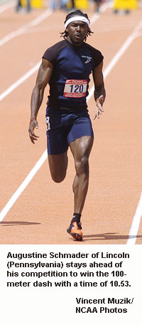 100-meter dash: 1. Augustine Schmader, Lincoln (Pa.), 10.53; 2. John Biacofsky, Mount Union, 10.63; 3. Greg Nixon, Howard Payne, 10.66; 4. Bret Blake, Neb. Wesleyan, 10.79; 5. Tom O'Neill, Oneonta St., 10.80; 6. Matt Turman, Neb. Wesleyan, 10.81; 7. Brandon Tripp, Greenville, 10.83; 8. Anthony Miles, New Jersey City, 11.92.