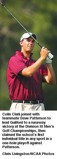 Clark is Guilford's first NCAA individual champion in any sport, but he earned that distinction reluctantly. With the team title already secured, neither golfer was excited about a playoff between teammates for individual honors.