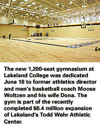 Facilities: Lakeland College formally dedicated its new gymnasium June 18 to Duane "Moose" Woltzen, former athletics director and men's basketball coach at the school, and his wife, Dona. The 1,200-seat gym (expandable to 1,800 seats) is part of the recently completed $6.4 million expansion of the Todd Wehr Athletic Center, which also includes a 4,400-square-foot fitness center, several new locker rooms, a classroom and a multipurpose room. The Moose and Dona Woltzen Gymnasium honors the couple who arrived in the community in 1964. Coach Woltzen coached basketball at Lakeland through 1988, compiling a 536-229 record (including 18 20-win seasons). After his retirement, Woltzen started a business booking overseas tours for university and college basketball teams.