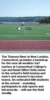 Facilities: Connecticut College recently installed a new all-weather turf surface at Lyn and David Silfen Field, home to the school's field hockey and men's and women's lacrosse teams. The new surface, which replaces a natural-grass field, is the ninth all-weather field in the 11-member New England Small College Athletic Conference, and also provides an additional facility for the college's soccer teams, as well as for club sports and intramurals. An estimated 600 Connecticut College students will use the field annually. Athletics Director Fran Shields said the new surface will alleviate weather-related scheduling problems, permit practices and games to be held year-round, and provide a venue for regional and national championship competition. "This facility makes a statement that our athletics programs are on a trajectory for a new level of excellence," Shields said. "Plus, the image of a turf field overlooking the Thames River (in New London, Connecticut) will put an indelible mark on the minds of visitors to our campus." The donor-funded $1.4 million project also includes several facility improvements benefiting track and field, including a new area for throwing events. The college also is considering establishing a memorial for a project subcontractor who died at the site during construction.