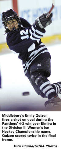 Middlebury finished the season 26-3-1, while Elmira, the top-ranked team coming into the tournament, ends at 24-4. Elmira won the Division III title in 2002 and 2003. Quizon's two goals in the championship game set a Division III record. The contest was the highest-scoring championship game in the tournament's young history. The previous record of six goals scored was set in the 2002 championship game between Elmira and Manhattanville. Middlebury's three goals in one period set a record as well.
