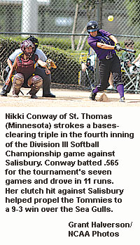 St. Thomas catcher Nikki Conway broke open a scoreless game with a bases-loaded triple in the bottom of the fourth inning. In seven tournament games, Conway was 13-for-23 (.565) with 11 runs batted in and 12 scored.