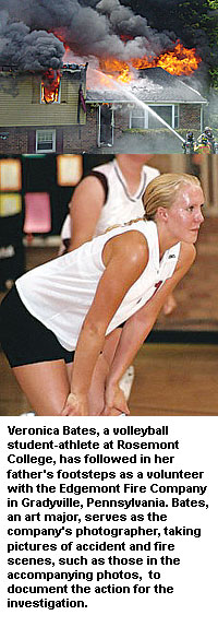 Bates manages her volunteer responsibilities around a full course load, as well as her athletics obligations. A pager alerts her to when the company has been called to action, and as long as she isn't in class or on the volleyball court, Bates is free to fly to the scene. Whether she catches one of Edgemont's fire engines to the scene or drives herself, immediately after arriving, she begins capturing the process of extinguishing a blaze or clearing an accident.