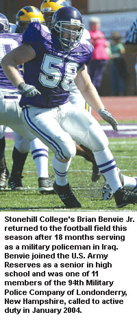 A member of the U.S. Army Reserves, Benvie spent the 2002 and 2003 seasons working his way from backup to starter, but he's just now getting the opportunity to enjoy a third season of Stonehill football after answering the call to serve and protect his country as a military policeman in Iraq.