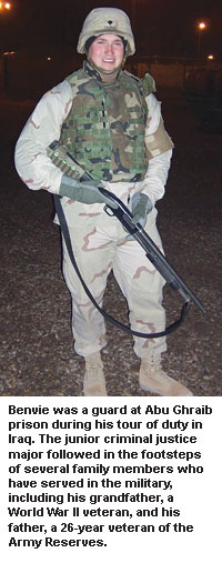 After two weeks of training with a military police unit in Puerto Rico and a two-week training period in Kuwait, Benvie was assigned to the Abu Ghraib prison, where he was responsible for guarding detainees.