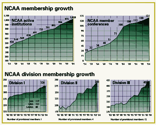 By division, active membership stayed generally the same. The Division I total of 326 institutions is static from last year, though there was some subdivision movement as Division I-AA gained two institutions from I-AAA. The Division II total of 281 is up three institutions from 2002-03, while Division III increased from 420 schools to 421.