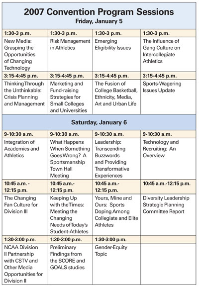 Among the more popular sessions for pre-registrants is one that seeks to get at the heart of the identity of the new generation of student-athletes. Entitled "Keeping Up With The Times: Meeting the Changing Needs of Today’s Student-Athletes," the session will help athletics administrators understand the culture of student-athletes, discussing everything from the popularity of social networking Web sites like Facebook and MySpace and personal digital music players like iPods to the influences of parents and self-perceptions.
