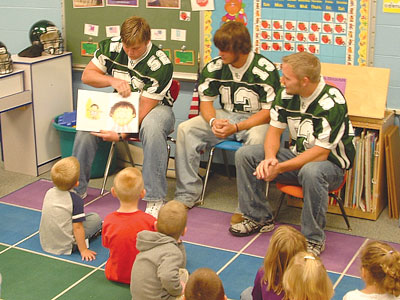 Bethany’s ‘Boomer and Books’ — First-year Bethany College (West Virginia) head coach Tim Weaver and three of his players traveled to a nearby preschool recently to kick off their new "Boomer and Books" program. Weaver, along with junior offensive lineman Justin Elkins, sophomore linebacker Ron Ermlick and sophomore defensive back Dante Fuscardo, spent time with 15 children. The program, named after Bethany’s mascot "Boomer," attracted several volunteers from the football team. At right, a future student-athlete tries on a helmet.