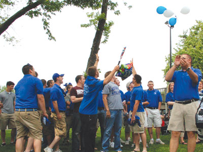Championship send-off — With Aurora University baseball coach Shaun Neitzel (right) leading a “Go Spartans” cheer, players released balloons to celebrate their departure for the NCAA Division III Baseball Championship finals. It was the school’s sixth trip to the tournament in 17 NCAA postseason appearances.